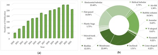 (a) Number of annual publications dealing with the cultivation of microalgae in photo-bioreactors (PBRs); (b) distribution of published papers per employed PBR type and configuration. (Data from Scopus, accessed on 2 May 2024. For (a), the search was performed within ‘Article title, Abstract, Keywords’ using the following keywords: microalgae AND photobioreactors OR photo-bioreactors; 2010–2023. For (b), the search was performed within ‘Article title, Abstract, Keywords’ using the following keywords: microalgae AND photobioreactors OR photo-bioreactors AND each PBR type; 2020–2023.