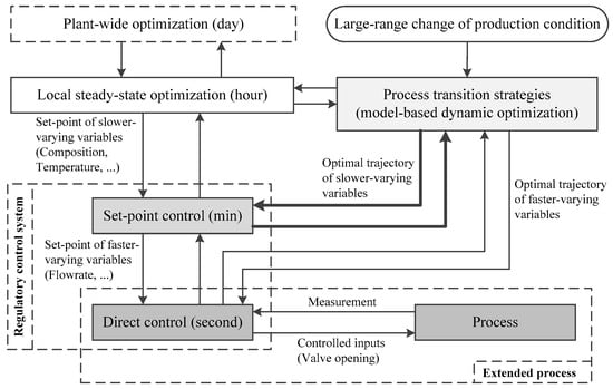 For chemical processes, the classical multilayer control structure is shown in Figure 1. The direct control layer is responsible for the safe operation of the process. Because of the rapidity of direct control, the extended process, namely the integration of the direct controllers and the process, is modeled by ignoring the adjusting time of direct controllers [33]. The set-point controllers are located at a higher layer, whose input is the result of steady-state optimization. For process transitions caused by large-range changes in production conditions, the optimal working condition is obtained by steady-state optimization [34]. The target of the set-point control layer is reaching the optimal operating point under new production conditions, whereas the optimality of the dynamic transition process is ignored. To improve the dynamic performance, model-based dynamic optimization is employed [2]. The optimal trajectory is the input of the regulatory control system, which consists of direct controllers and set-point controllers.
