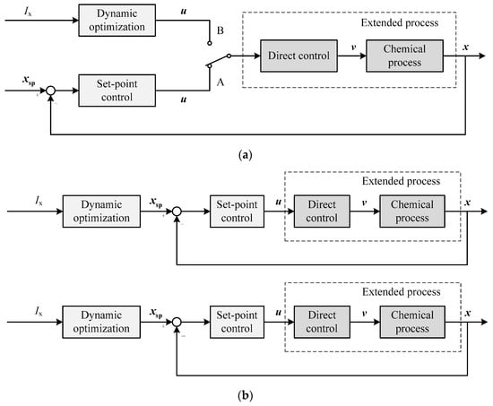 For direct optimization, shown in Figure 2a, Ix represents the production index, such as product quality; xsp represents the set-point; u represents the manipulated variables; and v represents the operating variables. The mode A represents the dynamic optimization enable, and the mode B represents the set-point control enable. Direct control is the basic layer of the control system. Considering reliability and robustness, the optimized object is the extended process, namely the integration of direct controllers and chemical processes, whereas the optimization/decision variables (u) are the inputs of direct controllers.