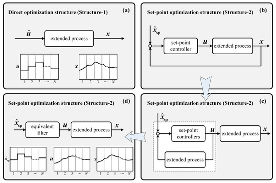 To discuss the difference between direct optimization and set-point optimization, the structural analysis is provided in Figure 3. For direct optimization (Structure-1 in Figure 3a), the optimal result, namely the discrete sequence, directly acts on the extended process. The control performance depends on the deviation caused by the discretization of the optimization vector. For set-point optimization (Structure-2 in Figure 3b), the discrete sequence acts on the integration of set-point controllers and an extended process. By equivalent structure variation, the set-point controller is transformed into a filter, named the equivalent filter (shown in Figure 3d). For instance, while the transfer function of an extended process is simplified as a second-order process, the order of the filter is three. That is to say, the major function of set-point controllers is not constant set-point management, and the softened discrete sequence acts on an extended process. The influence of discrete precision on optimization performance is reduced by the involvement of set-point controllers.