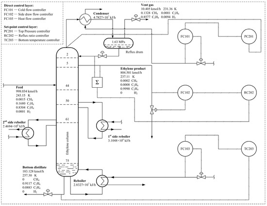 The experiment unit of this paper is commercial ethylene equipment. The process transition should be discussed while the decoking of cracking furnaces leads to a fluctuation in throughput. The diagram of the system, which consists of two parts: process (ethylene column) and regulatory controllers (direct and set-point controllers), is shown in Figure 4.