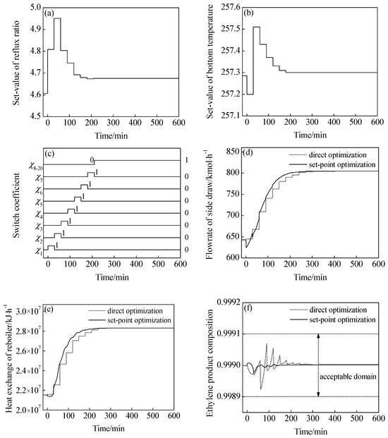 Figure 5a,b are the optimal trajectory of optimization variables, namely the connection of the optimal sequence in Table 2 to the timeline. Figure 5c is the trajectory of the B-spline function, which determines the discrete time grid. For direct optimization, the optimal sequences of manipulated variables, which contain the molar flowrate of the side draw and the heat flowrate of the reboiler, are calculated and shown as the dashed line in Figure 5d,e. The ethylene quality is manipulated by the discrete sequences and shown as the dash line in Figure 5f. For set-point optimization, the discrete sequences of controller input variables, which contain the set-value of reflux ratio and bottom temperature controllers, are softened and shown as the solid line in Figure 5d,e. The trajectory of ethylene quality is shown as the solid line in Figure 5f.
