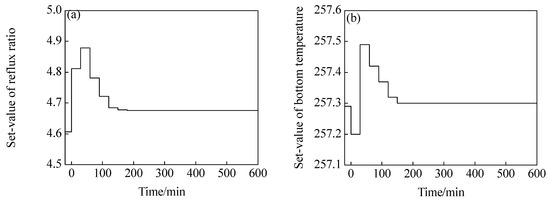 where is the set-value of reflux ratio controllers; is the set-value of bottom temperature controller; is the value of in ; is the value of in .