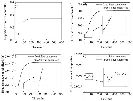 On the basis of the comparison in Figure 5d–f, the step change of manipulated variables is avoided by the employment regulatory controllers, and the curve is smoothed for flowrate of side draw and heat exchange of the reboiler. The softness of manipulated variables reduces the fluctuation of the ethylene product. In detail, the results are displayed in Table 3.