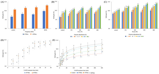 | Multiple Frequencies (40/80 kHz), an Output Power of 450 W at 45 °Brix Sugar Osmotic Solution | ||||||||||