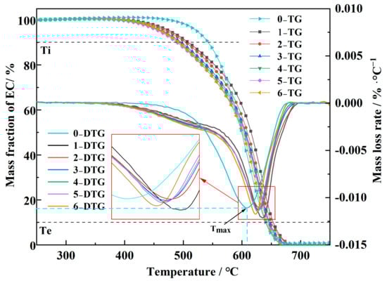 Figure 5 illustrates the TG and DTG curves of the carbon black samples. The carbon black samples have less VF content, and three specific temperatures in the EC oxidation process can be chosen as the characteristic parameters for evaluating the oxidizing activity of the carbon black: 1. the ignition temperature Ti (the temperature corresponding to the initial mass loss of 10% during the oxidation reaction); 2. the maximum oxygen oxidation rate temperature Tmax (the temperature corresponding to the maximum mass loss rate is the lowest point of the DTG curve.); 3. the final combustion temperature Te (the temperature appearing in a mass loss of 90%).