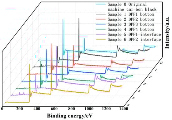 The oxidative decomposition of carbon black is exothermic, and the temperature of each measurement point inside the DPF illustrates a tendency of increasing and then decreasing with the regeneration of the DPF. When the temperature at the measurement point decreases, it can be assumed that the carbon black in the channel of the DPF has been completely oxidized and decomposed by the NTP active substance []. The flow rate of NTP was 30 L/min, and the initial regeneration temperature was 20 °C, and the initial loading of carbon black was 6 g/L. The DPFs were reacted separately at different regeneration stage, and the DPFs were dissected along the median axis, as shown in Figure 4. The carbon black samples were taken from the regeneration interfaces and the bottom of the DPF. Figure 4a illustrates the profile of DPF1, regenerated to 1/4; Figure 4b illustrates the profile of DPF2 regenerated to 1/2; Figure 4c illustrates the profile of DPF3 regenerated to 3/4; Figure 4d illustrates the profile of DPF4, which was basically regenerated completely and the retained portion was used for sampling. The red and orange boxes in Figure 4 are the carbon black sampling positions of the DPF regeneration interface and the bottom, identified by 1~6. The regeneration interfaces of DPF3 and DPF4 were close to the bottom, so the samples were taken from the same position. Table 3 illustrates the maximum temperature of regeneration at the carbon black sampling position, and sample 0 is the initial carbon black before the DPF regeneration. The maximum temperature at the sampling position at the bottom of the DPF increased as the regeneration stage of the DPF advanced, and the maximum temperature of the sampling position at the regeneration interface of the DPF was higher than that of the bottom at the same regeneration stage.