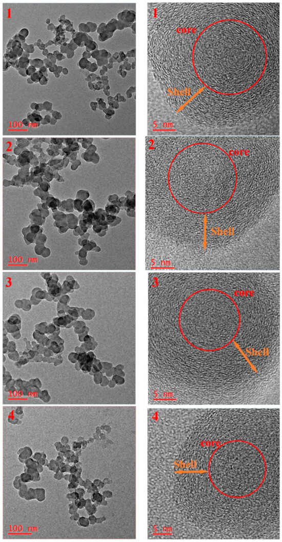 Figure 9 illustrates the aggregated morphology and core-shell structure of primary carbon particles of the carbon black samples obtained from TEM. Carbon black consists of dozens to tens of spherical primary particles forming a chain or cluster flocculent structure, which is due to van der Waals force and electrostatic gravity between particles [,]. The stacking of primary carbon particles in carbon black samples 1 to 4 gradually decreased and evolved from a cluster floc structure to a chain structure as the DPF regeneration stage advanced. As the NTP regeneration of the DPF advanced, NTP active substance entered into the internal cluster flocculated structure of particles through free diffusion and forced convection. The weaker part of the cluster flocculated structure was the first one to break under the oxidizing effect of the NTP active substance, and the cluster flocculated structure decomposed into the chain-like structure []. The aggregated morphology of primary carbon particles of carbon black samples 5~6 showed a clear chain-like structure. The surface charge of some carbon particles increased after being oxidized by NTP, leading to an increase in the electrostatic attraction between the particles. And this interaction caused the carbon particles to be more tightly packed together, thus reducing the particle size of the aggregated state [].