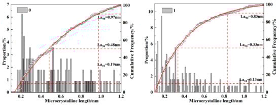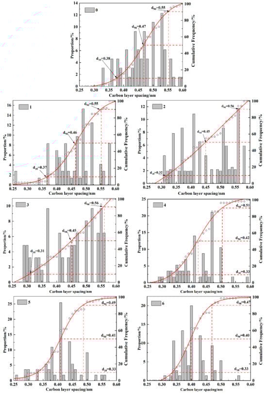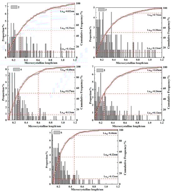 Figure 11 illustrates the distribution of microcrystal length (La) in primary carbon particles in the carbon black samples. The average value of La in sample 0 was 0.48 nm, and 80% of the microcrystalline size was concentrated in the range of 0.19 nm~0.97 nm. The microcrystalline lengths of carbon black samples 1~4 gradually decreased and the average value of La in samples 1~4 after oxidation gradually decreased from 0.33 nm to 0.27 nm as the regeneration stage advanced. The range of microcrystal length distribution in the primary carbon particles also significantly reduced, with a significantly higher percentage of microcrystals with lengths ranging from 0.12 nm to 0.80 nm. The presence of unpaired sp2 electrons at the microcrystalline edges of the primary carbon particles made it easier for the carbon particle components to combine with the O atoms in the NTP active substances and be removed from the surface of the primary carbon particles in the form of CO or CO2. NTP preferentially reacted with the physically defective parts of the longer microcrystals to form shorter microcrystals. Therefore, the average microcrystal length was significantly reduced after NTP treatment []. The microcrystal length at the regeneration interface at the same stage was smaller than that at the bottom, and the average values of La in samples 5 and 6 were 0.26 nm and 0.22 nm. The oxidative decomposition reaction between NTP and carbon black at the regeneration interface was more intense compared with that at the bottom, and more long microcrystals were cleaved to form shorter microcrystals, so that the length of the microcrystals was shorter than that at the bottom.