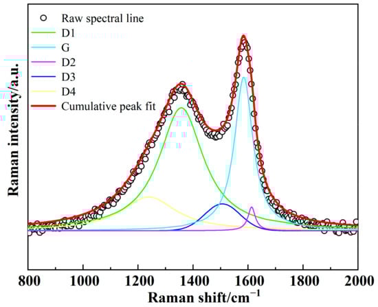 The Raman test results of carbon black showed strong peaks near 1360 cm−1 and 1580 cm−1, which are D peak (Disorder peak) and G peak (Graphite peak), respectively. According to the five-peak fitting method proposed by Sadezky, Table 8 illustrates the Raman peak positions and corresponding structures [,]. The first-order Raman spectra of the carbon black samples were fitted to the peaks using Origin2021 software (OriginLab Corp., Northampton, MA, USA), and the fitting results are shown in Figure 14.