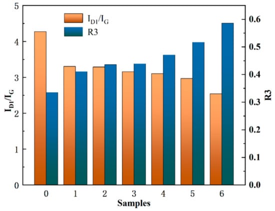 The relative peak intensity of D1 peak (ID1/IG) was used to characterize the structural defects at the edge of the graphite microcrystalline carbon layer in the carbon black samples, and the higher the ID1/IG, the more structural defects in the microcrystals and the higher the disorder. Since ID3/IG fluctuates greatly, it is difficult to accurately reflect the relative content of amorphous carbon, so the relative peak intensity of the D3 peak, R3 = ID3/ (IG + ID2 + ID3), is defined to characterize the content of carbon clusters in the carbon black sample. A high percentage of carbon clusters is usually considered to enhance the oxidizing activity []. ID1/IG and R3 of the carbon black samples are shown in Figure 15. As seen in Figure 14, ID1/IG of sample 0 is 4.27, and the most structural defects were found at the edge of the microcrystalline carbon layer of the carbon black before DPF regeneration. After the NTP reaction, ID1/IG of carbon black samples 1~4 decreased from 3.31 to 3.10; ID1/IG of Samples 5~6 located at the regeneration interface were decreased dramatically to 2.98 and 2.54, indicating that the structural defects at the edges of the microcrystalline carbon layer were reduced. The R3 values of the carbon black samples were significantly increased after the NTP reaction. R3 of samples 1~4 increased from 0.41 to 0.47, and that of samples 5~6 were 0.52 and 0.58, respectively, which indicated that the content of carbon clusters in the amorphous carbon increased. The R3 of samples 5~6 were 0.52 and 0.58, respectively, and the content of carbon clusters in amorphous carbon increased. The ordering of graphite structure in PM and the oxidation activity of PM were closely related. The stronger the ordering of graphite structure in the carbon material, the relatively weaker its oxidation activity was. From the TG analysis, the oxidizing activity of carbon black was elevated after NTP action. Although the reduction of structural defects at the edge of the microcrystalline carbon layer made the microcrystalline structure more ordered to some extent, the increase in the content of carbon clusters in the amorphous carbon contributed more to the disorder of the microcrystalline structure, which made the oxidizing activity of the final carbon black enhanced.