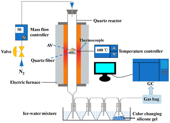 Pyrolysis experiments were performed in a quartz tube fixed-bed reactor with a 25 mm inner diameter and a reaction zone with a height of 1000 mm, as shown in Figure 1. For each experiment, approximately 6 g of AV was dispersed onto quartz wool above the grid of a quartz tube inside the pyrolysis reactor. With N2 continuously purged into the reactor system at a flow rate of 50 mL·min−1, the reactor was heated from ambient temperature to 400–700 °C with a heating rate of 10 °C·min−1. A temperature interval of 50 °C was chosen to investigate the influence of pyrolysis temperature on the decomposition behavior and product characteristics of AV material. After maintaining the target temperature for 30 min, the heating was stopped, and the device was naturally cooled down to room temperature under continuously introduced N2 gas to prevent the pyrolysis products from being oxidized. The generated volatiles passed through a condensing system consisting of three connected empty Erlenmeyer flasks cooled by ice–salt baths and collected as gas and bio-oil products. The solid residues on the quartz wool after pyrolysis were collected as biochar and weighed to determine its yield. As soon as the reactor started to be heated, the non-condensed gases were vented to the gas sample bag for further gas chromatography (GC) analysis. The condensable part in the flasks and quartz bottles was weighed before and after the pyrolysis experiment to calculate its mass fraction.