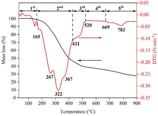The thermal decomposition of AV mycelial residues was investigated by TG–DTG analysis, and the results are shown in Figure 2. According to the inflection points shown in the TG and DTG curves, the pyrolysis of AV can be approximately divided into five stages. The first stage started from room temperature to 165 °C, mainly caused by the evaporation of water and light volatiles in the mycelial residues [25]. In the second stage, most of the organic matter such as carbohydrate, protein, and aliphatic compounds decomposed at a temperature interval from 165 °C to 431 °C, with a sharp weight loss of 52.95% [24]. As a result, the DTG curve presented quite a high weight loss rate, corresponding to two strong peaks at 267 °C and 322 °C, as well as a shoulder peak at 367 °C, respectively [26]. Moreover, aromatic species can also be formed in this stage due to thermal decomposition of aliphatic molecules. With further increase of pyrolysis temperature to the third stage of 431–520 °C, the thermal decomposition of more stable residual avermectin mycelial bacteria together with secondary reactions of these formed aromatic rings such as polymerization and condensation occurred, leading to a 6.92% weight loss and formation of biochar [19]. For the fourth stage at 520 °C to 669 °C, the carbonization process of mycelial residues proceeded with a small weight loss of 3.83% in the TG curve and a smooth weight loss rate observed in the DTG curve. The final stage ended above 830 °C and donated 1.23% weight loss, which is closely associated with the decomposition of inorganic substances (such as carbonate) and the release of inorganic species like potassium [27]. According to the result of TG analysis, a total weight loss of up to 72.6 wt% occurred for the AV mycelial residues during the whole pyrolysis process. The weight of residue was almost stable at 26.4% when the pyrolysis temperature increased to 700 °C, which was mainly assigned to the mixture of fixed carbon and ash [28]. Therefore, the pyrolysis temperature range of 400–700 °C was chosen for further investigation of product compositions and distributions during the AV pyrolysis process.