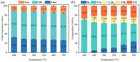 (a) The product yields and (b) gas volumetric fractions at different pyrolysis temperatures.