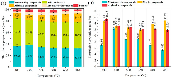 According to the proximate analysis result, AV has a high volatile matter content (75.77 wt%), which tended to form more bio-oil under pyrolysis. Figure 4 shows the main compounds and their relative proportions (% area) detected in bio-oil, particularly nitrogen-containing compounds, analyzed by GC/MS from AV pyrolysis at different temperatures. The chromatograms of the obtained bio-oil samples are shown in Figure S1, and the main compounds detected are listed in Table S1. Clearly, the bio-oils are quite complex mixtures, thus the identified compounds were classified into five groups for analysis, namely, nitrogen-containing compounds, acid and ester compounds, long-chain aliphatic compounds, monoaromatic hydrocarbons, and phenolic compounds. According to Figure 4a, the bio-oils obtained at different pyrolysis temperatures have similar components but slightly different proportions. The nitrogen-containing compounds and acids and esters were the dominant components of the bio-oil, which accounted for 32.14–38.70% and 42.99–48.85% of the quantified proportions, respectively. These results suggested that the pyrolysis process was mainly the decomposition of protein, lipids, and saccharides, similar to that reported in the literature [31,35]. In detail, the detected acids and esters are primarily acids, particularly octadecenoic acid, octadecadienoic acid, and n-hexadecanoic acid, which together account for almost 80% of the total quantified acid proportion. During the carbonization process, the hydrocarbons such as aliphatic and aromatic compounds were produced from the thermal degradation of long chain fatty acids together with the secondary reactions of oxygen-containing compounds [36]. As the pyrolysis temperature increased, the proportions of hydrocarbons especially long-chain aliphatic compounds increased from 7.69% to 14.47%, indicating that higher temperature is beneficial for cracking, decarboxylation, glycosidic bond cleavage, inner ring C–O group fragmentation, and C–C bond breakage processes [30]. The small fraction (3.1–4.96%) of phenolics detected in the bio-oil could be derived from decomposition of lignin [37].