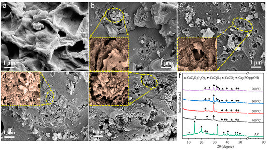 Figure 5 showed the surface morphology of natural AV and the biochar samples derived at different pyrolysis temperatures. Evidently, the AV feedstock exhibited a lamellar overlapping structure with a smooth surface [28]. After pyrolysis, the lamellar structure disappeared and microscopic structures such as particle accumulation and pores were formed on the bulk surface, mainly attributed to devolatilization during pyrolysis. From Figure 5b–e, it can be observed that similar morphologies were presented for the obtained biochar samples. For biochar obtained at 400 °C, an interlaced grid pore structure with 2–3 μm can be seen, which was filled with agglomerated particles. With the increase of pyrolysis temperatures to 500 and 700 °C, the smooth surface of AV was severely damaged by gas release, and more fragmentation, pore structure, and particle agglomerations were produced [40]. In particular, the pore size was smaller and denser, and the particle shapes became more regular and uniform at higher temperature. This result suggested that a higher pyrolysis temperature was beneficial for pore formation due to the complete cracking of the organic matter.