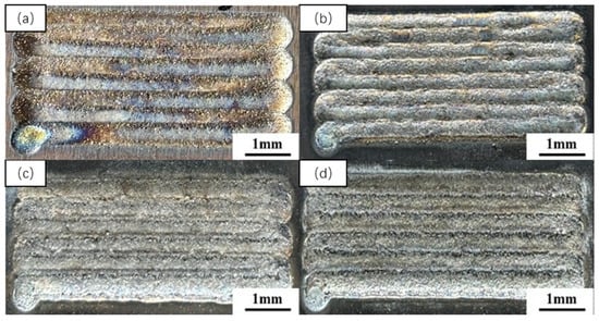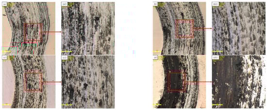 Figure 3 shows the macroscopic morphology of the coating with varying Y2O3 content. The overall surface morphology of the cladding layer was good, but there were still noticeable pits. The stellite-6 cladding coating with 2%Y2O3 had some pits, good flatness, and unmelted powder on the surface. It had the smallest size and number of visible pits and had good flatness, with less unmelted powder in the coating. The stellite-6 coating with 3%Y2O3 significantly increased the number and size of pores. The stellite-6 cladding coating with 4%Y2O3 had more unmelted powder, resulting in poorer overall cladding layer quality. The appropriate addition of yttrium oxide yielded better cladding coatings. However, excessive rare earth oxide addition negatively impacted cladding layer fluidity, causing more pores and cracks.
