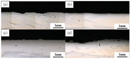 Figure 4 shows the cross-sectional morphology of the coating with varying Y2O3 content. The cladding layer was significantly improved after adding rare earth elements, and it was well integrated with the matrix, forming a metallurgical bond. When 2%Y2O3 was added, as shown in Figure 4b, the coating had fewer pore cracks, and the cladding layer’s surface was relatively smooth. In Figure 4c, by adding 3% rare earth, Y2O3 clearly increased the number of pores in the cladding layer. Figure 4d also shows that adding 4%Y2O3 results in small pores. The appropriate addition of rare earth elements facilitates the formation of the cladding layer, whereas excessive amounts impede slag discharge, causing an uneven microstructure and resulting in defects [].