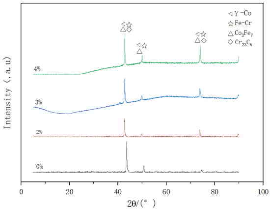 Figure 5 shows the X-ray diffraction pattern of coatings with varying Y2O3 contents. It can be seen from the figure that it was composed of γ-Co, Fe-Cr, Cr23C6, Co3Fe7, and other phases. When the peak value was 43°, the height of the diffraction peak rose with the increase in Y2O3 content. This indicates that Co and Cr from HSS enter the coating through the molten pool and react with the coating material to form various phase structures, and metallurgical bonding takes place between the coating and the substrate.