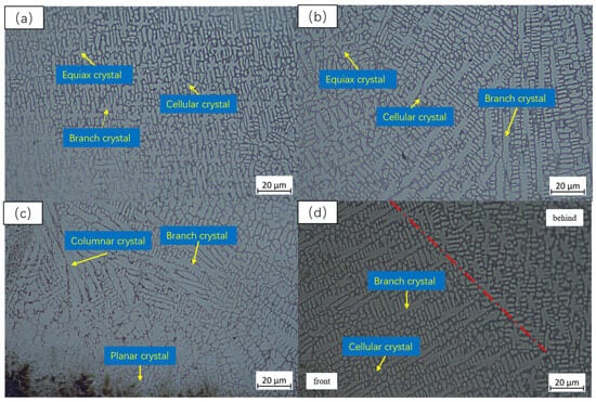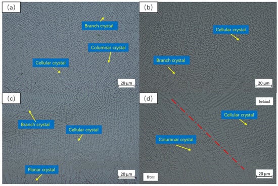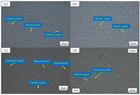 In Figure 6d, Figure 7d and Figure 8d, the lap area of the Y2O3 coating with different ratios is applied. The coating consists mainly of columnar crystals and dendrites, and it is evident that the structure before the coating is larger than that after the coating. The coagulation time of the tissue in this region is extended, allowing the tissue to grow more.