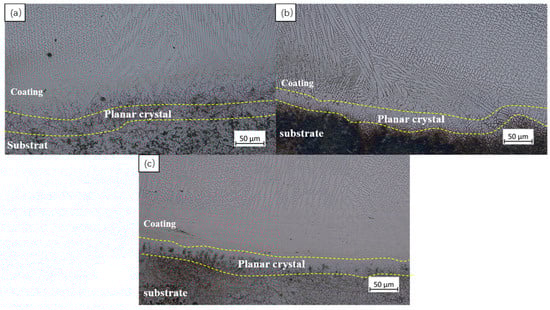 As shown in Figure 9, the cross-sectional microstructure of the bonding zone is mainly composed of planar crystals. Coarse dendrites, cellular crystal, and a network-like eutectic structure precipitated between grains appear from the bonding zone upwards. The characteristics of rapid melting and solidification in laser cladding led to the occurrence of element segregation with uneven chemical composition in the bonding area between the cladding layer and the substrate. Therefore, a transition zone without crystal nuclei was formed in this area, which was conducive to the growth of planar crystals. During the high-energy laser beam irradiation process, the liquid phase temperature in the bonding zone between the cladding powder and the substrate was high, and the degree of undercooling was low. Therefore, the cooling in this area was slow, and the crystallization rate was low, making it easy to form planar crystals. The undercooling gradually increased in the upper part of the bonding zone and its adjacent area. Due to the influence of the substrate dilution rate, a large amount of Fe elements in the substrate entered the coating without forming smaller crystal nuclei and generating coarse dendrites. The temperature gradient in the middle of the fusion coating was small, the undercooling increased, and the dilution rate had little effect, resulting in the generation of a large number of cellular crystals. The top tissue had the fastest cooling rate due to its minimum temperature gradient, proximity to the surface, and the blowing effect of the protected gas []. Moreover, the rare earth element Y acted as a heterogeneous nucleation point in the coating, thus forming a large number of equiaxed crystals and small network crystals.