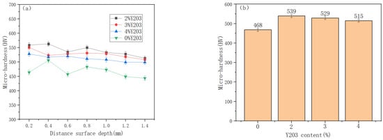 After melting, the cross-section of the sample was polished and cleaned with acetone. The microhardness test was carried out on an HVS-100A digital microVickers hardness tester with an experimental load of 10 N and a dwell time of 15 s. A point of 0.2 mm was taken away from the surface of the fusion layer on the cross-section of the fusion layer, and a point was taken every 0.2 mm downwards (2%Y2O3, 3%Y2O3, 4%Y2O3). Seven hardness points were taken from each sample, the hardness of each point was measured three times, and the average value was taken. The accuracy was 10−2 HV.