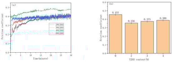 The friction coefficient and the average friction coefficient of the substrate and the friction coatings with different Y2O3 contents. (a) Friction coefficient of Y2O3 with different contents (b) Average friction coefficient of Y2O3 with different contents.