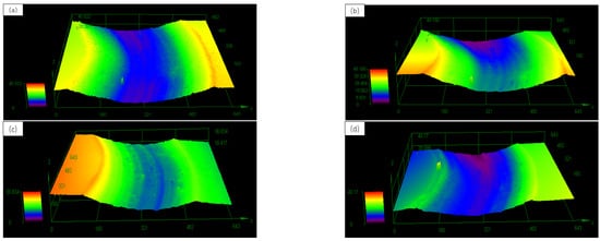 The three-dimensional surface morphology of samples with different Y2O3 content wear: (a) stellite-6, (b) 2%Y2O3, (c) 3%Y2O3, and (d) 4%Y2O3.