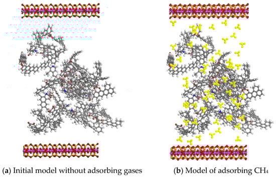 We assembled a simulation box comprising two inorganic layers and one organic layer (refer to Figure 2). Montmorillonite slices are used to represent the inorganic layer, while the anthracite molecules are used to represent the organic layer. The structural information of the montmorillonite slices was retrieved from the Cambridge Crystallography Data Centre (CCDC) database. First, two montmorillonite slices are arranged as depicted in Figure 2, followed by the absorption of a set of coal molecules into the interlayer space. In three-dimensional space, periodic boundary conditions are employed with a unit size of 41.4 Å × 35.8 Å × 30.5 Å, and each unit contains 4280 atoms. In our simulation, the coal pore model, which consists of both organic and inorganic matter, is considered a rigid atomic material. The simulation calculation was conducted using Material Studio visual software (latest v. 2023), with the adoption of the COMPASS II force field and medium geometric optimization method. The charge calculation process utilized the force field distribution algorithm, while the atom-based method was employed for the summation of electrostatic forces and van der Waals forces. Following molecular mechanics optimization, the model was subjected to local energy minimization and subsequently globally optimized through a dynamic annealing simulation to achieve global energy minimization.