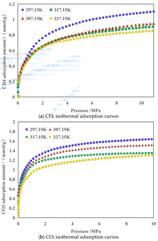 The isothermal adsorption characteristics of CO2 and CH4 at different temperatures were analyzed. Figure 4 shows the isothermal adsorption curves of CO2 and CH4. The results show that at the same temperature, with the increase in pressure at the early stage, the gas molecules in the vacuum state can be quickly adsorbed by coal molecules, showing a faster adsorption rate. When the high-affinity adsorption sites become occupied, the gas molecules shift to adsorption at low-affinity sites, exhibiting a reduced rate of adsorption. With the ongoing injection of gas, the process eventually reaches a point of saturation, demonstrating a gradual rate of adsorption. When the temperature rises at a constant pressure, the energy of CH4 increases, leading to sharper molecular motion and a decrease in potential energy on the surface of coal pores. As a result, it becomes more difficult for CH4 molecules to be adsorbed by the coal surface, resulting in a decrease in the adsorption quantity [33]. In the same coal pore model, the adsorption levels of CO2 and CH4 are significantly different, with CO2 showing better adsorption characteristics, followed by CH4. Under the conditions of 307.15 K and 101.35 kPa, the adsorption capacity of CO2 reaches 0.577 mmol/g, while that of CH4 is only 0.186 mmol/g under the same conditions. Therefore, in coal pores, CO2 has a stronger adsorption capacity than CH4, which means that it can displace CH4 from coal and accelerate CH4 desorption. The gas adsorption capacity obtained in this study exceeds that reported in the previous literature [34], primarily due to the incorporation of inorganic constituents within the established porous model of anthracite. The presence of inorganic matter can enhance coal’s capacity for CH4 adsorption without fundamentally altering its adsorption characteristics. Further investigation is required to determine whether a synergistic adsorption effect exists between the organic and inorganic components within this composite structure.