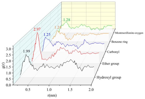 Figure 7 and Figure 8 are the RDFs of the main functional groups in coal with CH4 and CO2, respectively. CH4 and an ether group, a hydroxyl group, carbonyl, a benzene ring, and montmorillonite-oxygen (oxygen atom in montmorillonite), respectively, form obvious main peaks at 0.2624 nm, 0.3050 nm, 0.3015 nm, 0.3608 nm, and 0.4276 nm, and the order of the peak values from high to low is as follows: the ether group (2.97), the hydroxyl group (1.99), montmorillonite-oxygen (1.28), carbonyl (1.25), and the benzene ring (1.24). The main peak of CO2 with the hydroxyl group, carbonyl, the benzene ring, and montmorillonite-oxygen is formed at 0.2925 nm, 0.4292 nm, 0.2785 nm, and 0.3574 nm, respectively, and the corresponding peak values are 2.19, 2.01, 1.36, and 1.31. At the same time, the main RDF peak of CO2 and the ether group presented a double-peak phenomenon, and the peak values of CO2 and the ether group are 1.52 and 1.29 at 0.3618 nm and 0.4977 nm, respectively, which promoted the strong interaction between CO2 and oxygen-containing functional groups. The oxygen atoms on montmorillonite form a weak adsorption layer with CO2 at a relatively far distance, so the adsorption is the weakest.