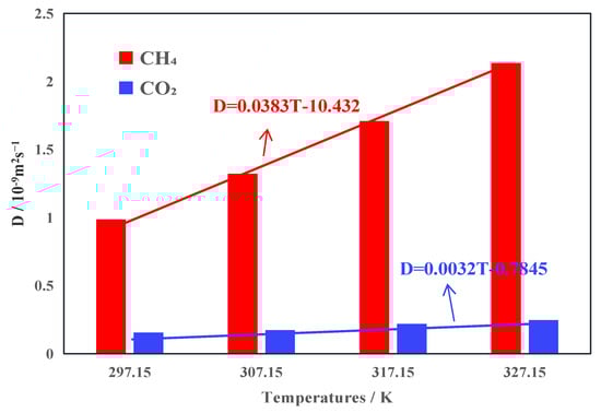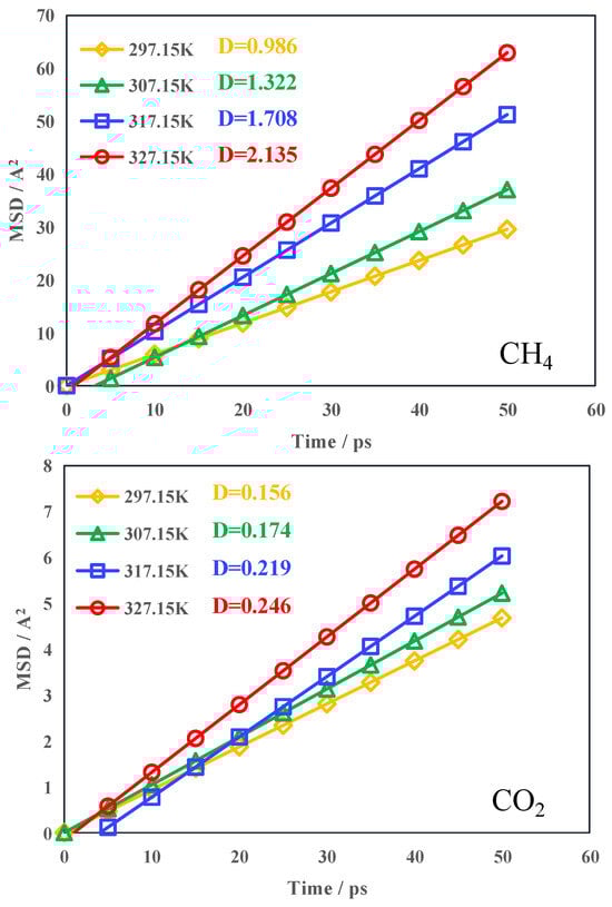 The diffusion coefficient is frequently employed as a physical parameter for describing the behavior of gas migration within a medium. Based on Equation (4), it is possible to calculate the gas diffusion coefficient in the pore at various temperatures. Figure 9 and Figure 10 quantitatively characterize the diffusion laws of CH4 and CO2 in the coal pore model, and the fitting coefficients of the curves are both high, which ensures the accuracy of the calculated diffusion coefficient. The results show that the MSD of CO2 and CH4 in the pore model increases with time, and the MSD of gases increases with temperature. With the increase in temperature, the diffusion coefficient of a gas increases, and the internal molecular energy increases. Based on the law of energy preservation, the internal molecular energy will transform into dynamic energy, leading to an increase in molecular movement [37]. Consequently, with the rise in temperature, there is a corresponding increase in the rate of gas diffusion, facilitating its escape from the coal seam. In this study, with the increase in temperature, the growth rates of the CO2 and CH4 diffusion coefficients are different. The growth rates of CO2 diffusion coefficients at different temperatures are 11.54% (297.15 K–307.15 K), 25.86% (307.15 K–317.15 K), and 12.33% (317.15 K–327.15 K); the growth rates of CH4 diffusion coefficients are 34.09% (297.15 K–307.15 K), 29.26% (307.15 K–317.15 K), and 24.98% (317.15 K–327.15 K).