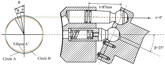 whereas A is the piston’s cross-sectional area, z is the number of pistons, r is the radius of the distribution circle of the ball end A on the flange of the drive shaft at the connection end, β is the cylinder tilt angle.