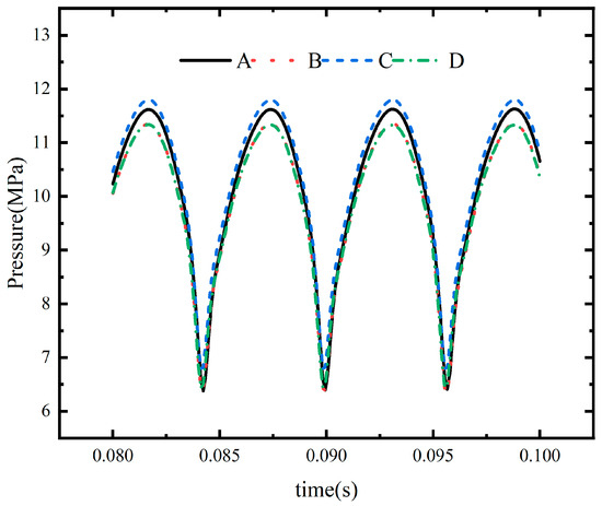 The inclined-axis piston pump, as a result of its operational mechanism, encounters cyclical pressure fluctuations. As depicted in Figure 3, the trend in these fluctuations is uniform across the models examined. Model A records a peak pressure of 11.62 MPa and a minimum pressure of 6.4 MPa; it should be noted that the repetition of values for Model A likely indicates a typographical error in the source text. Model B exhibits a peak pressure of 11.35 MPa and a minimum pressure of 6.4 MPa. Model C’s peak pressure is documented at 11.8 MPa, with a minimum pressure of 6.8 MPa. Meanwhile, Model D has a peak pressure of 11.3 MPa and a minimum pressure of 6.43 MPa.