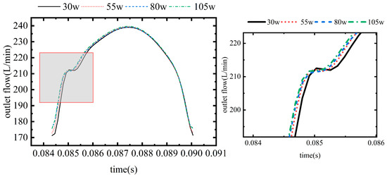 The inclined-axis piston pump, as a consequence of its operational principles, is subject to periodic flow pulsations. As depicted in Figure 4, the trend in these pulsations is uniform across the models analyzed. Model A achieves a peak flow rate of 239 L/min, with a nadir of 171.3 L/min; Model B registers a peak flow rate of 239.4 L/min and a minimum of 172 L/min; Model C exhibits a peak flow rate of 239.13 L/min and a minimum of 175.72 L/min; whereas Model D demonstrates a peak flow rate of 239.7 L/min, with its minimum flow rate also recorded at 175.72 L/min.