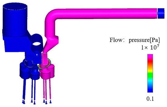 The distribution mechanism of this pump is equipped with a spherical oil film, where the termini of the oil film are established as pressure output interfaces. Damping holes are situated at the piston’s extremities to emulate the leakage that transpires between the piston and the flange during its operational phase, with the resultant pressures equated to the discharge oil pressure at 0.2 MPa. The simulations are executed under load pressures of 10 MPa and 20 MPa, respectively. Simulated pressure cloud diagrams of the plunger are shown in Figure 6 and Figure 7.