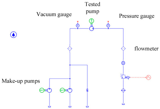 A stable oil supply to the test pump was ensured by employing two makeup pumps. Thereafter, the load pressure of the pump was measured using a pressure gauge. Concurrently, the flow rate of the test pump was monitored with a flowmeter. Additionally, a proportional relief valve was utilized to regulate the load pressure of the pump.
