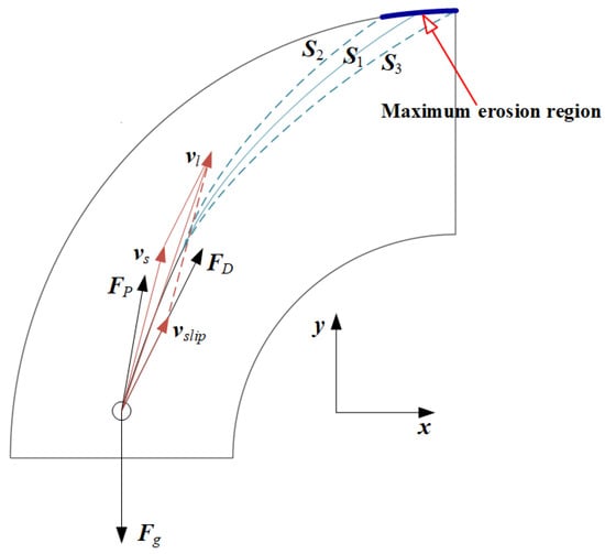 Relative to the liquid, particles have greater mass and inertia, which contributes to a slow decrease in vs,y, the velocity component in y direction, and a slow increase in vs,x, the velocity component in x direction. This leads to a non-collinear relationship between particle velocity and liquid velocity, denoted as vs and vl, respectively, as shown in Figure 1. Such a relationship differs from that associated with the straight pipe. Furthermore, the directions of the slip velocity, vslip, and the drag force, FD, no longer coincide with particle velocity and liquid velocity. The substantial inertia of the particle results in a rotational angle smaller than 90° for the particle trajectory S1. The change in particle mass stimulates an alteration of particle trajectory. With increasing particle mass, the particle trajectory undergoes a leftward shift, as evidenced by trajectory S2. Conversely, a decrease in particle mass results in a rightward shift of the trajectory, as indicated by trajectory S3. Therefore, the maximum erosion is generally produced at the outer surface near the elbow outlet, which has been validated through experimental results [17].