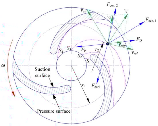For the impeller machinery, the rotating impeller is usually employed as a reference frame for investigating the motion of particles with respect to the impeller. In Figure 2, the forces, velocity, and trajectory associated with a particle in the flow passage of a centrifugal impeller are presented. Since the rotating impeller can be taken as a non-inertial reference frame, it is necessary to account for inertial forces, such as the centrifugal and Coriolis forces. In the impeller passage, the Coriolis force, FCori, is directed towards the pressure surface of the blade, perpendicular to the relative velocity of the particle. Two kinds of centrifugal forces are defined: one is denoted as FCen,1, which is generated owing to the rotation of the impeller, while the other centrifugal force, denoted as FCen,2, is generated due to the curved geometry of the flow channel. The first centrifugal force is perpendicular to the circumferential velocity of the particle and directs towards the impeller outlet, while the second centrifugal force is perpendicular to the relative velocity of the particle and is directed towards the suction surface of the blade. The expressions for the three types of inertial forces are as follows [18,19]: