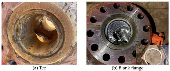 Pipeline transport serves as a cost-effective but reliable method in various industries such as petroleum, chemical, food, and pharmaceuticals. For the lifting of petroleum and oil from a well, the participation of sand is inevitable, which may cause surface damage, especially at locations where the flow direction changes sharply, such as elbows and tees. The eroded pipe joints are illustrated in Figure 3. The erosive wear of pipes may incur operation accidents [20]. Various measures have been employed to mitigate the erosive wear, such as applying erosion-resistant materials and protective coatings and optimizing the structure of the pipeline.