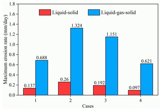 The erosion characteristics vary considerably with flow pattern. The injection of gas into a liquid–solid flow can enhance the erosive wear of the elbow, which demonstrates the contribution of the bubbly flow. The presence of bubbles induces the generation and expansion of the secondary flow, causing an increase in both liquid and particle velocities and an alteration of particle trajectories [17]. As a result, the erosive wear associated with the gas–liquid–solid flow is more severe than that arising in the solid–liquid flow, as shown in Figure 5. Cui et al. [27] have investigated the effect of the bubbly flow encountered in the black water treatment system on the erosion of the elbow. It is found that the erosion rate increases sharply when the gas volume fraction exceeds 10%.