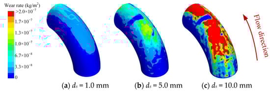 Previous research on the erosive wear in various elbows is summarized in Table 1, where the information about elbow geometry, particle parameters, research methods, and operating conditions is listed. The particle size adopted in these studies is generally less than 300 μm, and the solid volume concentration is lower than 5%. Dynamic behaviors of large particles have been investigated in Refs. [32,33]. With high momentum and large contact area, large particles induce more severe erosion compared to small particles. Meanwhile, for the interaction between large particles and the target surface, a buffer layer is formed over the target surface, and it protects the surface from the erosive wear [34]. The patterns of erosive wear caused by particles of different sizes are different. In an elbow, as shown in Figure 7, the area with high wear rate shifts towards the upstream flow since the ability of large particles to follow the carrier fluid is weak. Furthermore, the nonuniformity of the distribution of the wear rate over the curved surface is enhanced with increasing particle size, as indicated in Figure 7.
