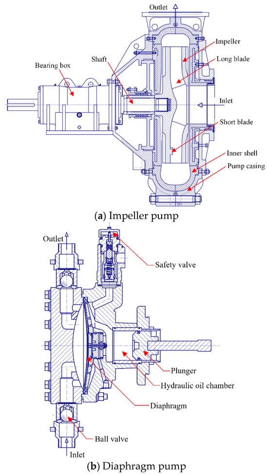 Pumps are used to impart energy to the transported medium, which thereby gains enough energy to overcome the frictional and local resistance. The pump conveying the mixture of liquid and solid particles is commonly referred to as the slurry pump. An impeller-type slurry pump is shown in Figure 8a. The concentration of the slurry transported can be as high as 30%. Solid particles in the slurries have high erosivity, and the resistance of the pump to erosion can be achieved through optimizing the hydraulic components and properly selecting materials for the components.