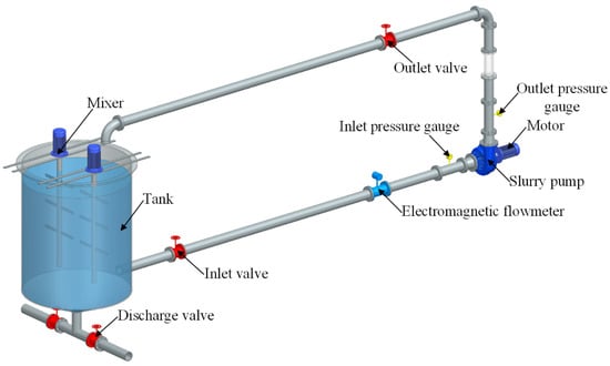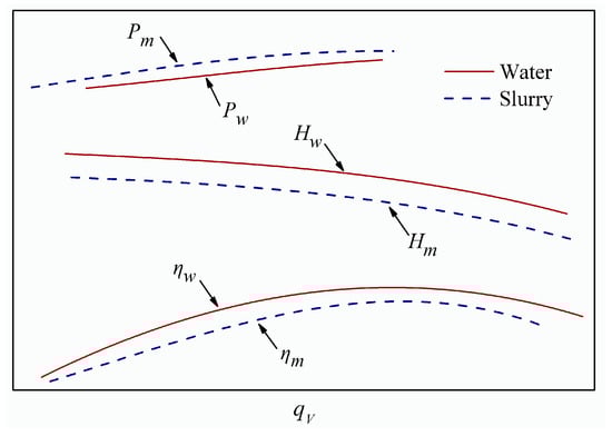 The equipment handling the solid–liquid two-phase fluid is exposed to the risk of particle settlement. This is induced when the energy received by the particles cannot sustain their settling velocity. The pump is responsible for imparting energy to particles. Generally, the pump head and efficiency are reduced when water is replaced with slurry [43,44,45,46], as illustrated in Figure 9. Moreover, due to wear of the hydraulic components, the pump may operate under off-design conditions. In this case, excessive hydraulic loss will be induced, and the wear will be aggravated.