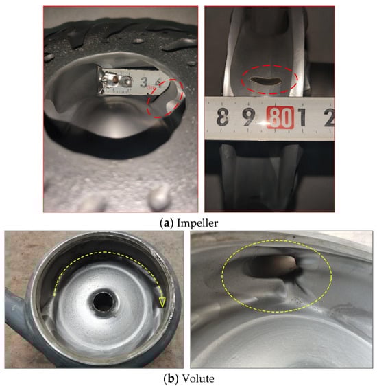 Pump impeller and volute after wear test. The worn parts of the impeller are blade inlet edge and outlet section of the blade pressure surface, and the latter has been worn through. The most distinctly worn part of the volute is the volute tongue.