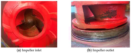 A paint removal test has been performed for a centrifugal pump with sand particles of 6.0 mm in median diameter. The resultant patterns of the erosive wear of the impeller are shown in Figure 12. It is observed in Figure 12a that the most severe wear occurs at the leading edge and the impeller hub. Upon entering the impeller, particles undergo a transition of motion from axial to radial direction under the action of the centrifugal force. Subsequently, the particles impact the blade leading edge. With high inertia, the particles are unable to rapidly complete the transition of motion. In this situation, they impact the impeller hub at large impact angles, causing significant erosive wear of the impeller hub. As shown in Figure 12b, the hub and the pressure surface of the impeller have been severely eroded. For the hub, a large piece of paint has been removed, and for the blade pressure surface, apart from the removal of paint in a sheet pattern, erosion pits are identifiable.
