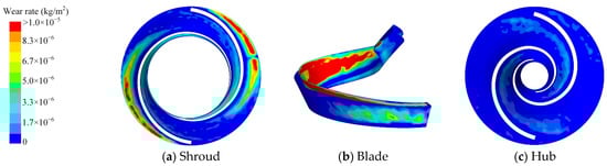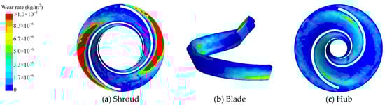 Numerically obtained wear patterns of the impeller of a deep-sea mining pump are illustrated in Figure 13 and Figure 14. When particles of 15.0 mm are transported, the impeller shroud exhibits severe erosive wear, which is concentrated near the blade pressure side. In contrast, erosion of the hub occurs primarily near the suction surface. Furthermore, the leading edge, the middle part of the suction surface, and the outlet of the pressure surface are susceptible to erosive wear. When particle size increases from 15.0 to 30.0 mm, the area of wear on the shroud is reduced. Meanwhile, the erosive wear of the blade suction surface is intensified, which is explicitly related to the increased centrifugal force.