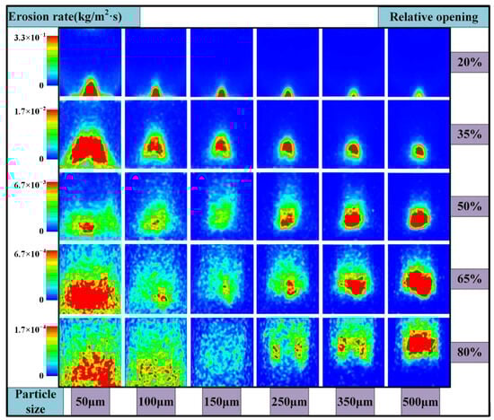 Xu et al. [76] and Lin et al. [77] investigated the wear of a ball valve using experimental and numerical methods. Effects of particle size and the opening are considered. They evidenced that the flow coefficient of the valve is reduced when a single liquid is replaced with the mixture of liquid and solid particles. Furthermore, when the opening of the valve is higher than 65%, the flow coefficient is even smaller. The wear rate is high at low openings, which are responsible for high particle velocity, as shown in Figure 15. Consequently, severe damage of the internal wall of the valve is demonstrated. When the mass flow rate of particles remains constant, the number of particles increases with decreasing particle size. The interaction between particles and the valve components is strengthened, and the area of erosion is enlarged.