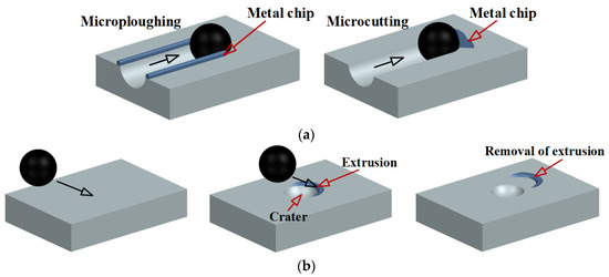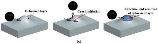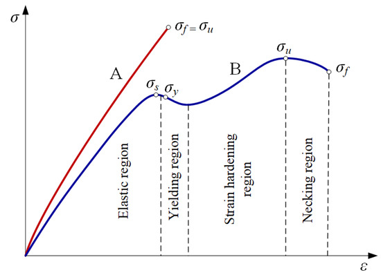The mechanical properties of materials, as represented by the stress–strain curve plotted in Figure 16, are significant for understanding the wear mechanism. As marked with B, the ductile material like the mild steel is featured by a yield point, and it sequentially experiences the elastic process, yielding process, strain hardening process, necking process, and fatigue process with increasing stress and strain. When stress is applied onto a material, the deformation process is closely related to the magnitude of the stress and mechanical properties of the material. When the stress magnitude is lower than the elastic limit of the material, σs, the deformation is elastic, which signifies that the material can recover its original shape when the load is withdrawn. When the stress exceeds the yield stress of the material, σy, the deformation is plastic, demonstrating that there is a permanent deformation even after the stress is removed. If the stress is further increased, it can eventually reach the fracture stress of the material, σf, causing the material to fracture. Compared to the ductile material, the brittle material, marked with A, may fracture at low strain with little or no plastic deformation. The area under the stress–strain curve, which serves as an indicator of toughness, is typically smaller for the brittle material compared to that of the ductile material. Brittle materials have a limited ability to resist the plastic deformation and absorbing energy before fracturing. The stress–strain curves plotted in Figure 16 are obtained from tensile tests while the wear of the tested object is produced through the method of indentation.