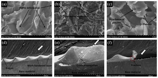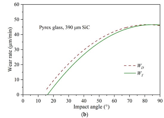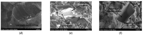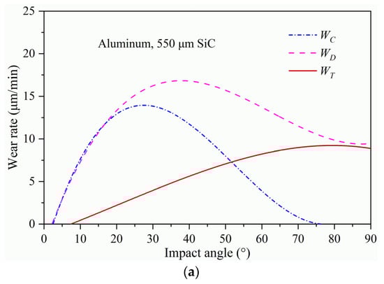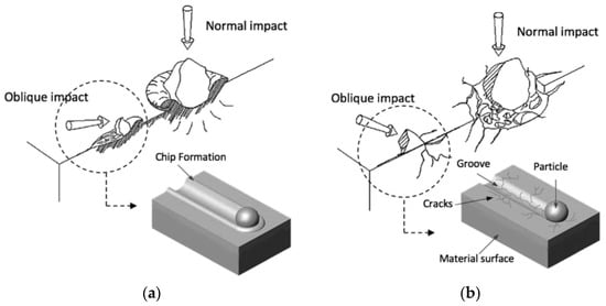 In his wear model, Finnie [1] proposed two concepts known as cutting wear and deformation wear to describe how the characteristics of wear vary with the impact angle. However, it is easy to confuse the two concepts with the abrasive (cutting) wear and the deformation wear discussed in Section 5.1. The cutting wear and the deformation wear in the erosion model represent the wear caused by the tangential and normal velocity components of particles at any impact angle, respectively. The concepts of the cutting wear and deformation wear apply to both ductile and brittle materials, as shown in Figure 17. For ductile materials, the deformation wear causes the deformation of the target material, while the cutting wear is responsible for creating the groove and chips. Regarding brittle materials, both the deformation wear and the cutting wear can lead to the generation of cracks and material failure.
